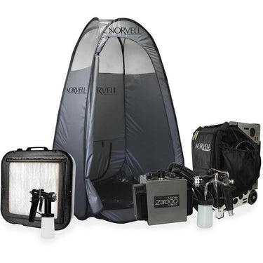 Norvell Pro Travel Kit. Take your business on the road with the Norvell Pro Travel Bag, the perfect accessory for the on-the-go spray tech. This lightweight yet sturdy rolling bag was designed by the Norvell team specifically to provide a solution to our mobile tech needs. The interior provides easy-access portals and storage for your Mobile Z3000 HVLP system, hoses, cords and other essentials. A built in shelf on the interior easily stores 2 liters of solution plus additional necessities. Inside the front flap are multiple pockets to organize your NeetFeet, exmitts, and other disposables. A convenient gun-hook mounts on the telescoping handle for spraying ease.