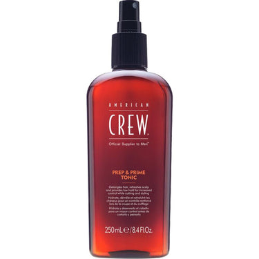 American Crew Prep & Prime Tonic Spray / 8.4 fl. oz. - 250 mL. A lightly-moisturizing and refreshing hair tonic that prepares the hair for cutting and styling, by adding a light hold and texture for increased control and manageability. Plus, it provides heat protection. 8.4 oz