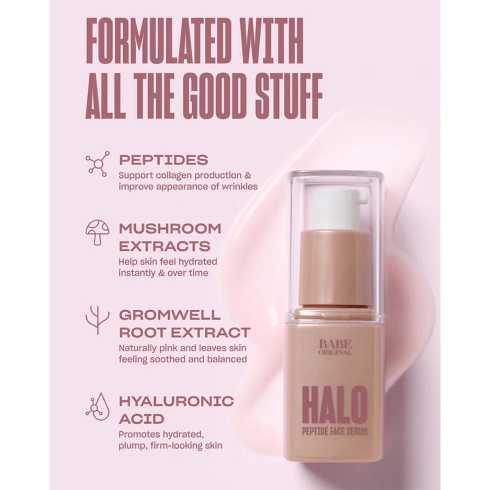 Babe Original Halo Peptide Face Serum for Glowing, Hydrated Skin. When your clients skin needs a little bit of everythinghydration, firming, smoothing, and a radiant finishthis serum is your all-in-one solution. The Babe Original Halo Peptide Face Serum delivers a high-performance formula designed with multitasking professionals in mind. Packed with powerhouse peptides, deeply hydrating hyaluronic acid, and calming botanicals, this 30 mL bottle delivers professional-grade results with a silky-smooth finish clients will see and feel.