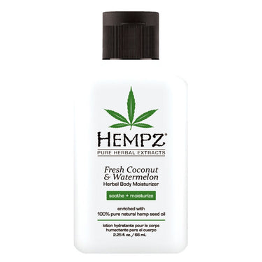 Hempz Coconut & Watermelon Moisturizer / 2.25 oz. - 66 mL. Hempz Fresh Coconut & Watermelon Herbal Body Moisturizer is enriched with100% Pure Natural Hemp Seed Oil and infused with our signature blend of soothingAloe, Omega rich Vitamin E, calming chamomile, Avocado Extracts and hydrating Coconut Oil and Watermelon Extract to help nourish and moisturize skin. Vitamin E helps retain skin's natural moisture content. Aloe helps soothe, calm, protectand hydrate skin. Chamomile & Avocado Extracts calm, soothe and nourish skinkeeping it moisturized and soft. Coconut Oil nourishes, moisturizes and helps protect skin while anti-aging properties help regain a youthful glow. WatermelonExtract, a powerful antioxidant and skin conditioner rich in Vitamin C, helps protect and nourish skin against free radicals. Non-greasy, lightweight formula.Paraben-Free, Gluten-Free, 100% Vegan. THC Drug Free.
