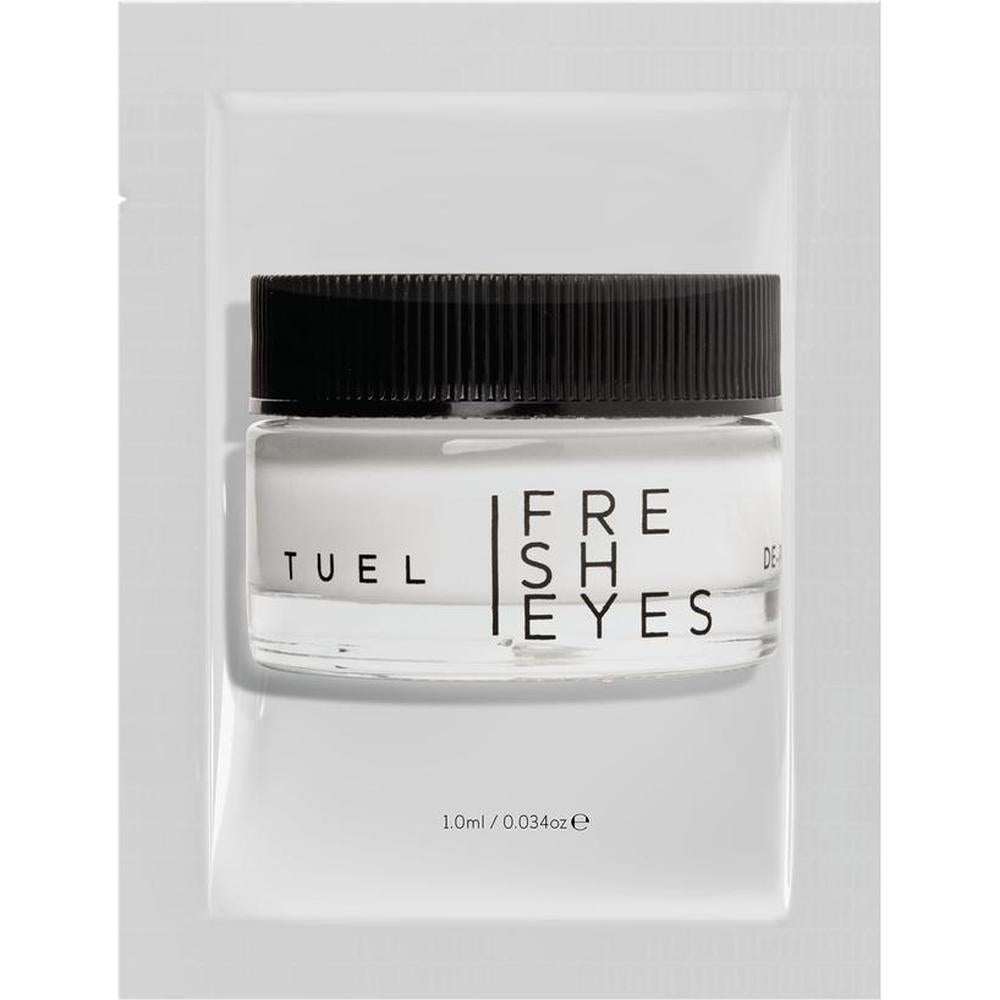 Tuel Fresh Eyes De-Puff Lotion Sample. Bring tired eyes back to life with Tuel's Fresh Eyes De-Puff Lotion. This lightweight, rejuvenating lotion is formulated to address puffiness, inflammation, and fine lines around the delicate eye area. With the potent blend of natural moisturizers and powerful antioxidants, it helps reduce puffiness, condition the skin, and provide essential protection against environmental stressors.