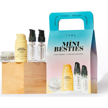 Tuel - Mini Besties Kit: Four Mini Heroes for Radiant Skin. Elevate your skincare routine with the Tuel Mini Besties Kit, a curated collection of four powerhouse products designed to exfoliate, hydrate, brighten, and protect. Each item in this kit delivers professional-grade results, making it an essential for beauty professionals and their clients. Whether it's glowing skin or lasting hydration, this set ensures your clients leave feeling their best—while giving them the option to recreate that glow at home.