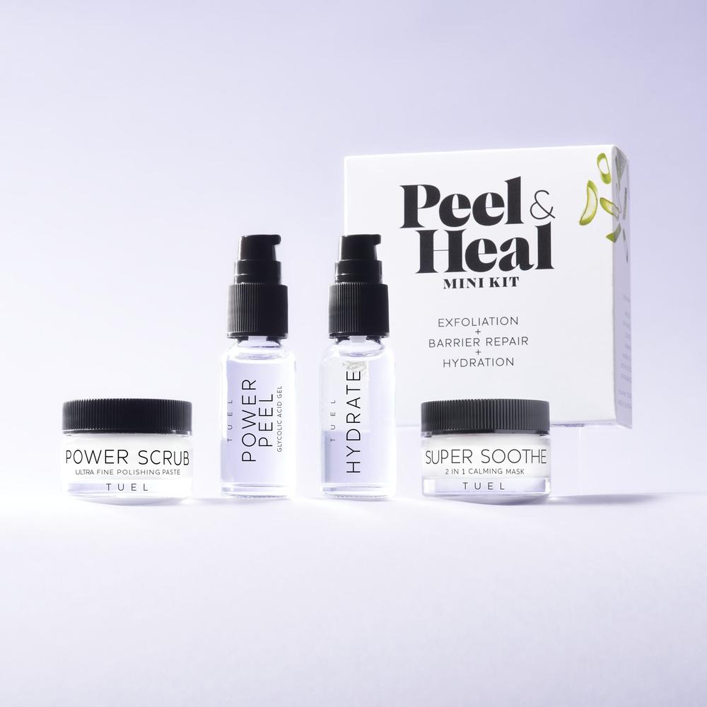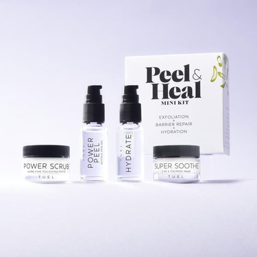 Tuel Peel & Heal Mini Kit. Elevate your skincare routine with the Peel & Heal Mini Kit, a four-piece powerhouse designed to rejuvenate and transform skin with dual exfoliation, hydration, and calming botanicals. This expertly curated set works synergistically to deliver a brighter, healthier complexion, making it an essential for beauty professionals and their clients alike. Compact and versatile, it's perfect for retail or professional use, providing results your clients will love.