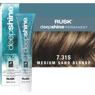 Rusk Deepshine Pure Pigments Conditioning Cream Color / 7.31S Medium Sand Blonde / 3.4 oz. Rusk® Deepshine® Conditioning Cream Color utilizes the most advanced haircolor technology from Italy. Micro Pure Pigment Technology ensures haircolor molecules penetrate deeply, producing longer-lasting results. Advanced Marine Therapy evens out porosity and seals the cuticle to improve the overall strength and integrity of the hair. This permanent haircolor provides incredible color clarity, yielding consistently silky, shiny results.