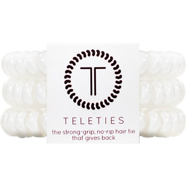 Teleties Small Hair Ties - No Pinch Please - Strong Grip, No Rip - Coconut White / 3 Pack. Hold your hair and enhance your style with Teleties. The strong grip, no rip hair tie that doubles as a bracelet. Strong, pretty and stylish! Teleties are designed to withstand everyday demands while taking your look to the next level.