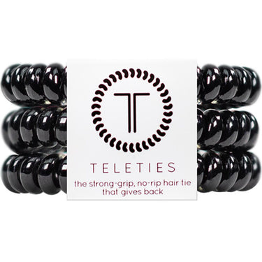 Teleties Small Hair Ties - No Pinch Please - Strong Grip, No Rip - Jet Black / 3 Pack. Hold your hair and enhance your style with Teleties. The strong grip, no rip hair tie that doubles as a bracelet. Strong, pretty and stylish! Teleties are designed to withstand everyday demands while taking your look to the next level.
