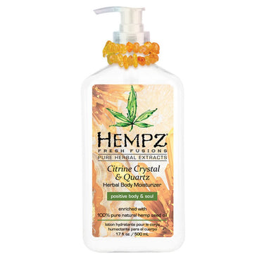 Hempz Citrine Crystal & Quartz Moisturizer / 17 oz. - 500 mL. Creamy, dream-like consistency softens and smooths skin, helping retain moisture and hydration. Beautiful, bright citrus blend leaves skin lightly scented. Quartz dust gives skin a subtle, gem stone glow. Enriched with 100% Pure Natural Hemp Seed Oil. Paraben-Free, Gluten-Free, 100% Vegan, THC-Free, Dye-Free.