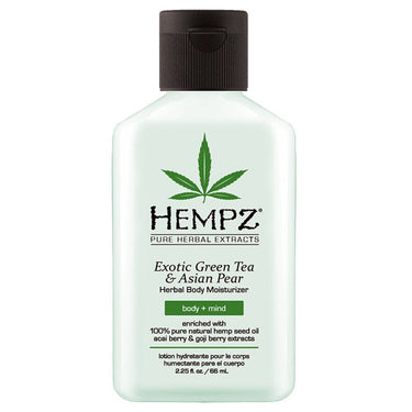 Hempz Green Tea & Asian Pear Moisturizer / 2.25 oz. - 66 mL. Hempz Exotic Green Tea & Asian Pear Herbal Body Moisturizer is enriched with 100% Pure Natural Hemp Seed Oil and infused with a revitalizing blend of essential extracts. Beneficial Ingredients: Pure Natural Hemp Seed Oil, Green Tea Extract, Pear Extract, Acai Berry Extract, Goji Berry Extract, Vitamins A, C, E & B5. Calms, softens and conditions skin while providing dramatic skin hydration. Essential Extract Blend of Green Tea, Pear, Acai Berry and Goji Berryleaves skin feeling refreshed, revitalized and balanced. Vitamins A, C, E & B5 help protect skin from natural and environmentally triggered oxidants and elements. Assists in leaving skin feeling smoother, firmer and more toned. Helpsstimulate skin with natural anti-inflammatory properties and skin regenerating ingredients. Paraben-Free, Gluten-Free, 100% Vegan. THC-Free.
