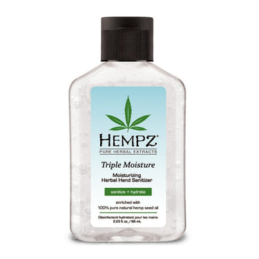 Hempz Triple Moisture Hand Sanitizer / 2.25 fl. oz. - 66 mL. Hempz Travel Size Triple Moisture Moisturizing Hand Sanitizer is an all in one sanitizer and moisturizer that kills 99.99% of most common germs leaving skin soft and hydrated. Lightly scented with refreshing blend of Enchanted Grapefruit and Sparkling Peach our signature sanitizer is enriched with Coconut Oil, Mango Seed Butter and Vitamins A and E to hydrate and condition skin with every application.