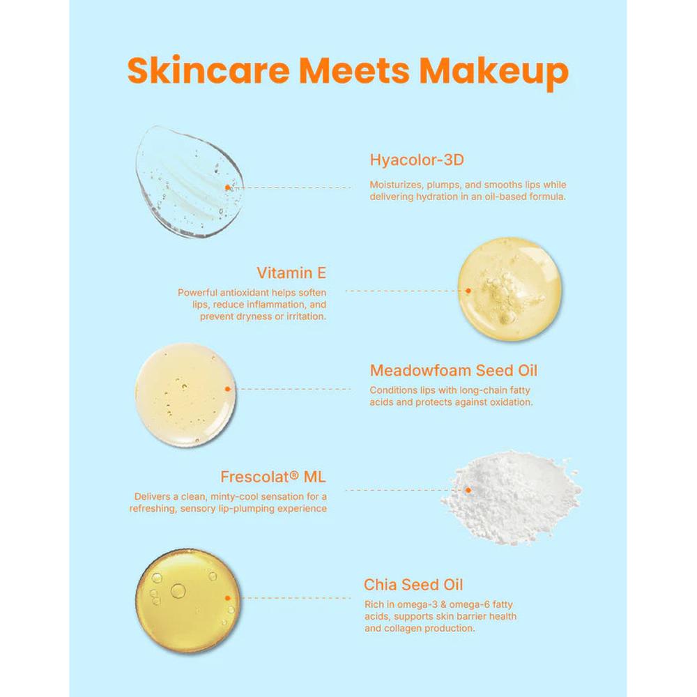 - Hyaluronic Acid draws in moisture for a cushioned, fuller-looking pout.