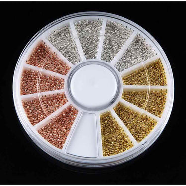 This Nail Art Mini Beads set, which includes sizes of 0.8mm, offers a variety of colors like Gold, Silver, and Rose to cater to any client's taste. The pack contains Mini Beads perfect for creating both elegant, subtle nail art and bold, buildable 3D designs.