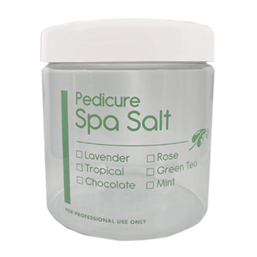 The 16 oz. Pedicure Spa Salt Jar - EMPTY JAR ONLY! / Case of 75. Perfect for storing and organizing scented spa salts. Features checkboxes for the following fragrance options: Lavender, Tropical, Chocolate, Rose, Green Tea, and Mint. Spa salts not included. Sold by the case only.