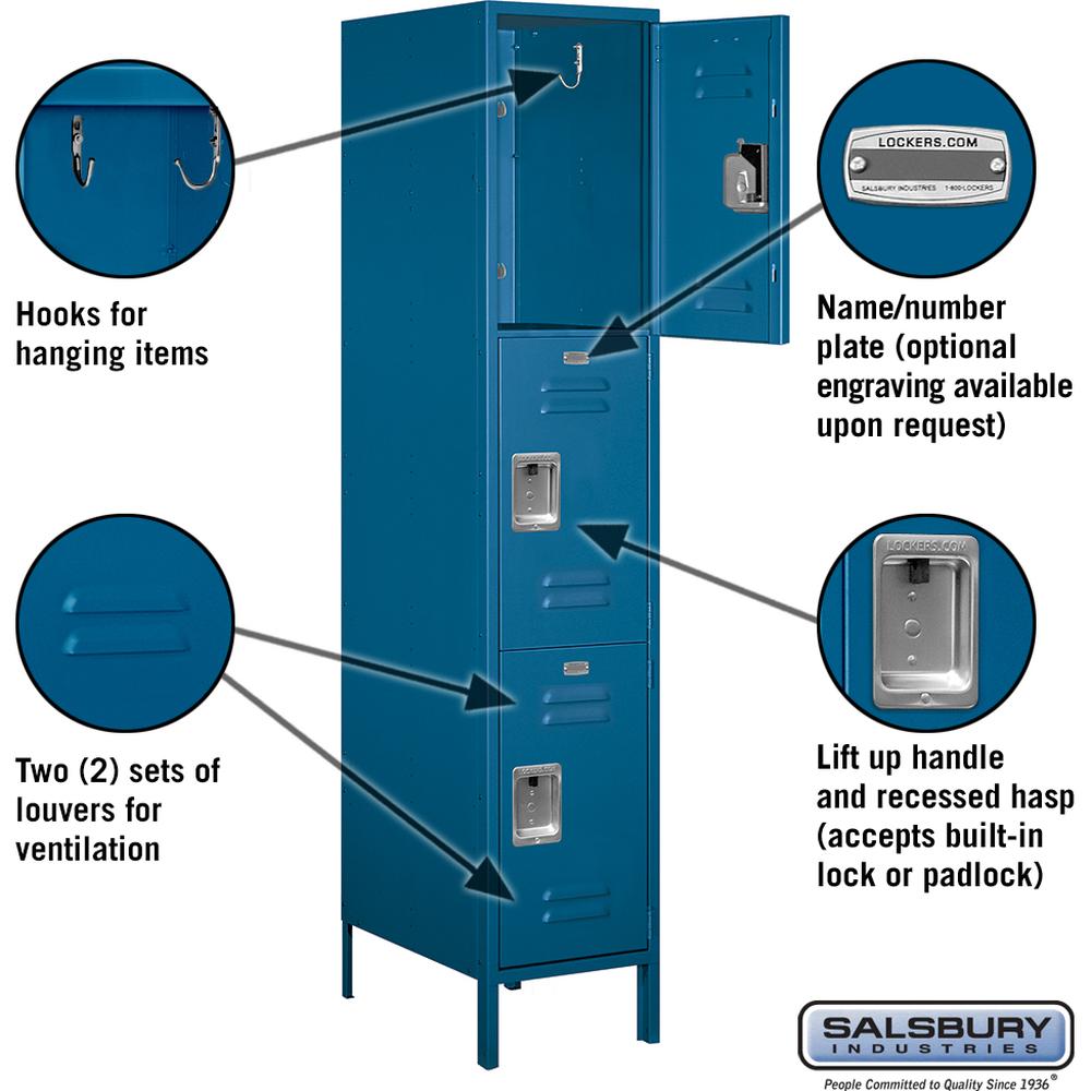 18" Wide Triple Tier Standard Metal Locker - 1 Wide - 6 Feet High - 21" Deep by Salsbury