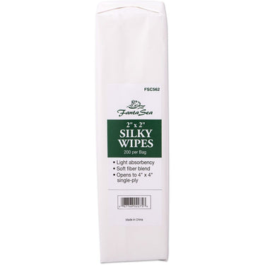 The 2" X 2" Non-Woven Silky Wipes / 200 Count. Soft, silky fiber-blend wipes are strong and durable, and are perfect for applying and removing products during facial services. Lint free with light absorbency. Each wipe opens to 4" x 4" single-ply 200 per bag