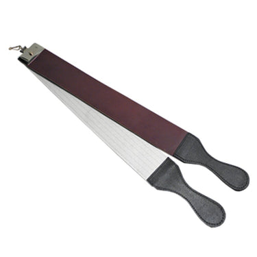 The 21" Barber Strop. Horsehide and canvas strop. Includes swivel with nut and bolt, hang clip, and ergonomic handle. Measures 21"L x 2-1/4"W.