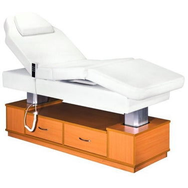 The 3 Motor Electric Dual Purpose Facial Bed / Massage Bed With Wooden Drawers. This sexy 3 motor bed combines good looks and functionality! This is a dual purpose bed - massage as well as facial. It comes with 2 spacious wooden storage drawers at the bottom . It has aesthetically appealing stainless steel motorized pillars that move the bed up and down. It features a remote control that adjusts height, back and legs and can even transform it from a massage bed to a facial bed and vice versa... with a single button push.