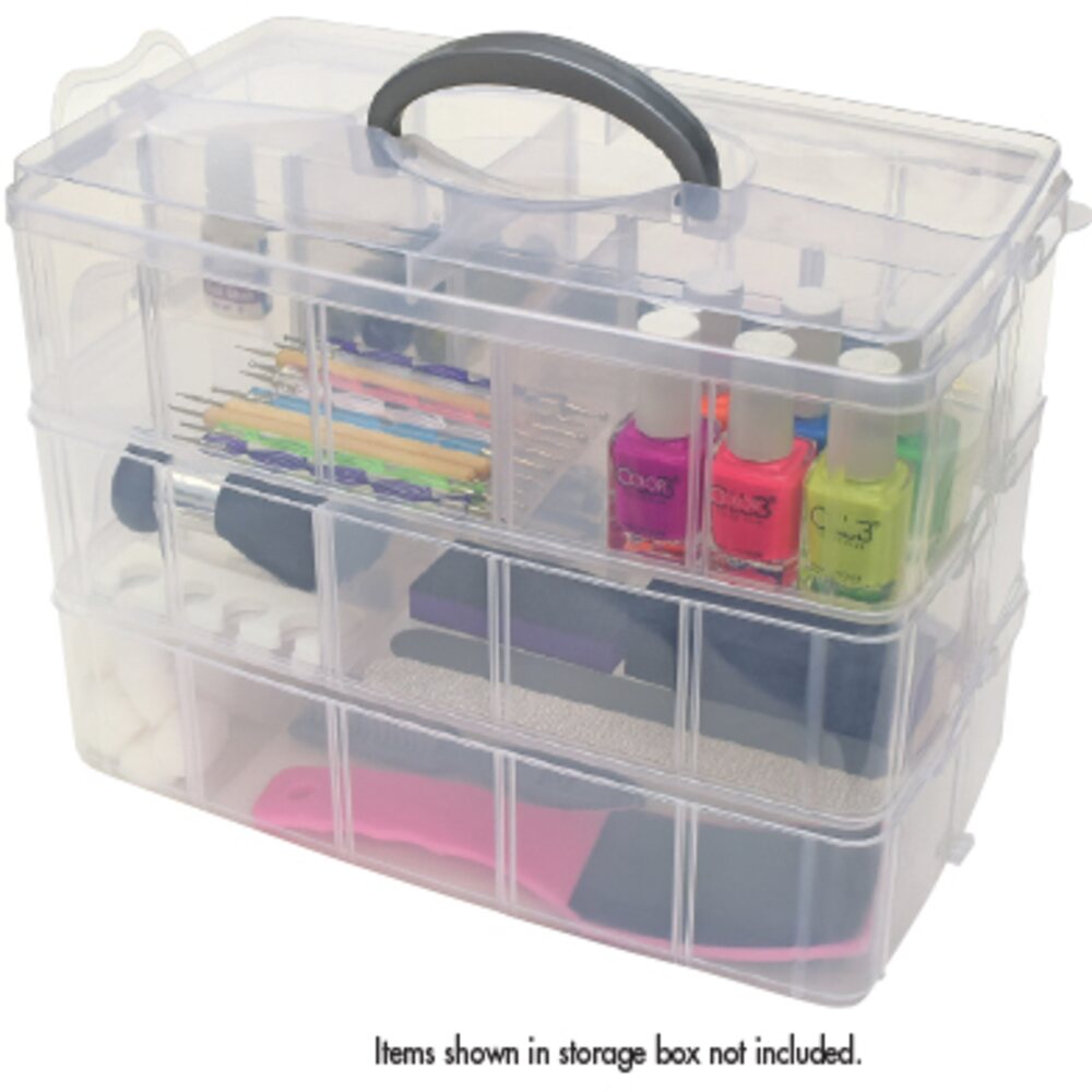 The 3-Tier Storage Box / 9.5"L x 12.5"W x 7.25"D. 3-tier storage box is the best way to store, organize, and travel with nail supplies. Features 3 stackable tiers with snap closures. Each tier has 10 individual storage compartments with removable dividers. Measures 9-1/2"L x 12-1/2"W x 7-1/4"D. Each tier is 3" deep.