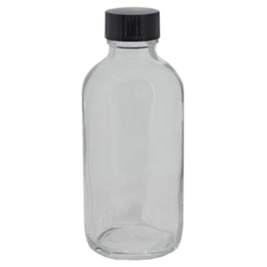 The 4 oz. Clear Boston Round Glass Bottles - 4.5"High x 1.75"Diameter / Case of 128. 4 oz. Clear Glass Bottle - 4.5"High x 1.75"Diameter / Case of 128. Store and pour liquids in these attractive glass round bottles. Narrow mouth for precision pouring. Maximum product visibility. Black caps included. Sold by the case only. 128 Bottles to a case.