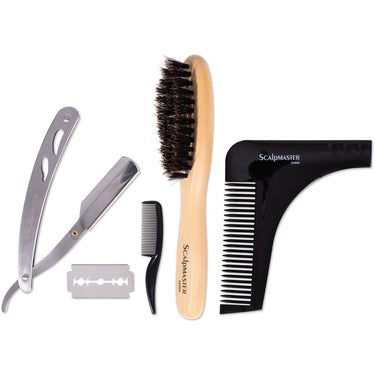 The 4 Piece Grooming Kit. Maintain a well-groomed beard with this 4-piece kit. Includes: Stainless-Steel Shaving Razor with 5 replacement blades. Provides a close, smooth shave without irritation. Measures 5-1/2" long when closed and 8-1/4" long when open. 3" Mustache Comb. 100% Boar Bristle Beard Brush great for grooming and smoothing beards. Measures 1/2" wide x 6-1/4" long. Beard Styling Tool used to easily shape and groom perfect symmetrical facial hair on the neckline, cheek line, jaw line, and goatee.