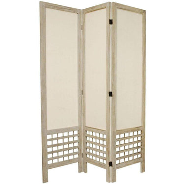 The 5-1/2 ft. Tall Open Lattice Fabric Room Divider - Burnt Brown, Burnt Grey or Burnt White / 3 Panels, 4 Panels or 6 Panels. This open lattice design floor screen is designed with a traditional wood frame and fabric. The panel frames are slightly heavier and more substantial than most designs, and the cotton panel shades are particularly durable. The open lattice work at the bottom adds an attractive design element, creating both an eye catching piece of furniture as well as an extra solid and durable folding screen.