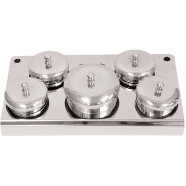 The 5 Piece Manicure Liquid & Powder Jar Set. Set includes 5 jars with lids and 4 nail brush holders. Large jar measures 2-1/4" diam. and 4 small jars measure 1-3/4" diam. Base measures: 7-3/4"L x 4"W x 1-1/4"H.