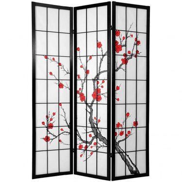 The 6 ft. Tall Cherry Blossom Shoji Screen - Black / 3 Panels - Size - 42"W x 70"H (folded, as shown). This stately room divider combines a classic Japanese emblem - the cherry blossom - with traditional shoji rice paper. Shoji paper, renowned for its translucent glow in the sunlight, has been a beloved part of Japan's remarkable architecture for over a thousand years. This elegant folding screen updates the design for the modern home, and is a perfect way to section a space, provide privacy, or add a decorative accent.