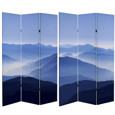 The 6 ft. Tall Double Sided Misty Mountain Canvas Room Divider / 3 Panels. Bring the serenity of the tip of the mountain range to everyday. This peaceful room divider in shades of blue is the perfect calming backdrop to the everyday hustle and bustle of life. Would be perfect for your treatment rooms, relaxation room, lobby, home or office