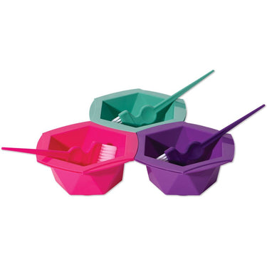The 6 Piece Bowl And Brush Set. Set of 3 brightly colored bowls in pink, teal, and purple with matching feather briste brushes. Perfect for staying organized during multi-formula applications. Bowls interlock, creating a stable surface, are stackable, and have a non-slip rubber ring on the bottom. Each bowl measures 6-1/4"W x 2-1/2"H. Each brush has 2" wide, synthetic feather bristles, for naturallooking color distribution.