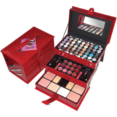 The 75 Piece Makeup Train Case. Leatherette, red alligator-printed train case contains: 45 eyeshadow colors, 12 lip colors, 2 pressed powders, 2 concealers, 2 lip glosses, 2 lipsticks, 2 eye pencils, 4 blushes, 1 blush brush, and 1 mirror.