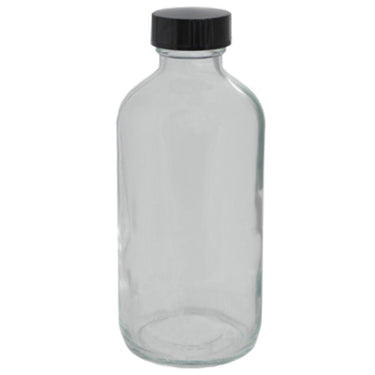 The 8 oz. Clear Boston Round Glass Bottles - 5.5"High x 2.125"Diameter / Case of 96. 8 oz. Clear Glass Bottle - 5.5"High x 2.125"Diameter. Store and pour liquids in these attractive glass round bottles. Narrow mouth for precision pouring. Maximum product visibility. Black caps included. Sold by the case only. 96 Bottles to a case.
