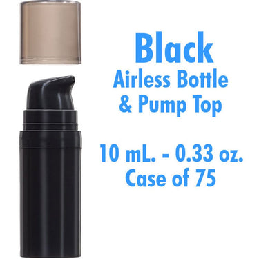 Airless Bottle and Pump - Black with Translucent Black Overcap - 10 mL. - 0.33 oz. / Case of 75. Help maintain efficacy of creams and lotions with this airless bottle with cap. The airless pump mechanism dispenses all of the product down to the last drop. It is also the ideal size for product testing or travel.