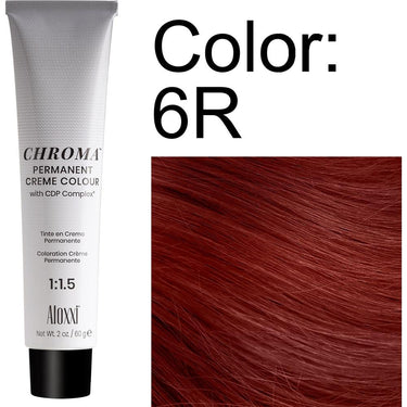 Aloxxi Chroma Permanent Creme Colour - 6R / 2 oz. Aloxxi Chroma Permanent Creme Colour is a professional-grade product that offers vibrant, long-lasting results with a perfect balance of conditioning, color deposition, and protection. Designed with the beauty professional in mind, this formula provides an easy-to-use, highly efficient system that guarantees consistent, predictable color every time. Whether you're creating a new color or retouching existing highlights, Chroma ensures your clients leave with rich, even color that lasts and remains stunning. Say goodbye to color fading and hello to vibrant, healthy-looking hair with the power of Aloxxi Chroma.