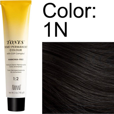 Aloxxi Tones Demi-Permanent Colour 1N / 2 oz. Effortless, controlled color that delivers stunning shine and deep conditioning thats what professional stylists demand, and thats exactly what Aloxxi Tones Demi-Permanent Colour delivers. This ammonia-free formula is crafted for artists who want more than just color they want performance that respects hair integrity while achieving precise, high-definition results. In shade 1N (Natural Black), you're equipped with an elegant, deeply pigmented tone that refreshes, blends, or enhances with sophisticated coverage and superior conditioning.