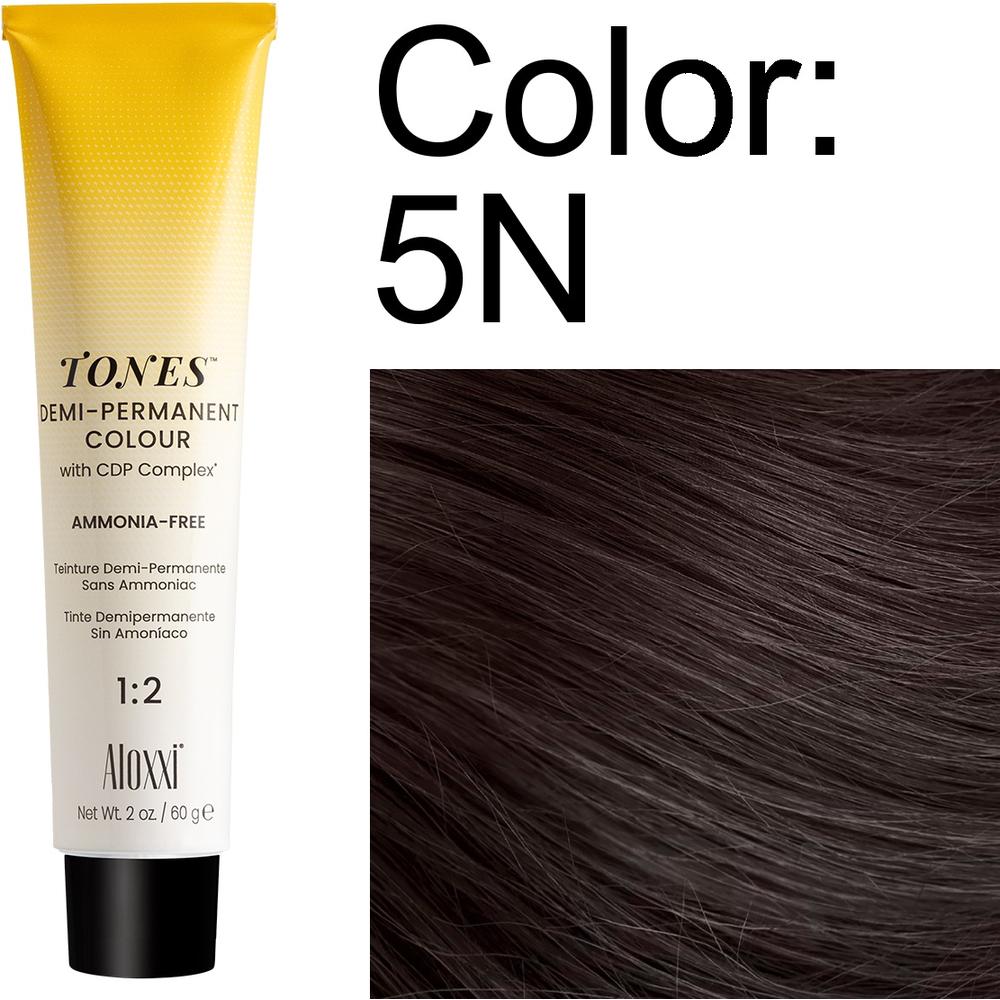 Aloxxi Tones Demi-Permanent Colour 5N - 2 oz. Formulated for the discerning professional, Aloxxi Tones Demi-Permanent Colour in 5N is more than just a color serviceit's a multi-benefit treatment that elevates every salon experience. This luxurious, ammonia-free formula blends high-definition crystallized micro-pigments with protective conditioners and a nourishing oil complex, delivering unmatched brilliance and vibrancy without compromising hair health. Whether you're refreshing color, blending grays, or adding depth and shine, this demi-permanent powerhouse ensures stunning results with lasting impact.