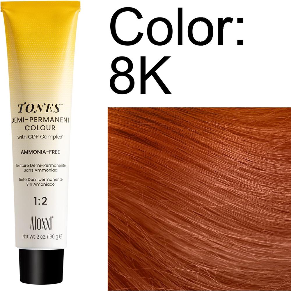 Aloxxi Tones Demi-Permanent Colour - 8K / 2 oz. Aloxxi Tones Demi-Permanent Colour is designed to bring out the best in your clients' hair, offering vibrant, long-lasting results that keep their locks looking stunning and healthy. This ammonia-free formula is perfect for professionals who demand effective and reliable results without compromising on quality. With the power of the innovative CDP Complex, Aloxxi Tones ensures complete coverage, moisturizing conditioners, and a brilliant shine that leaves hair looking fresh and rejuvenated every time.