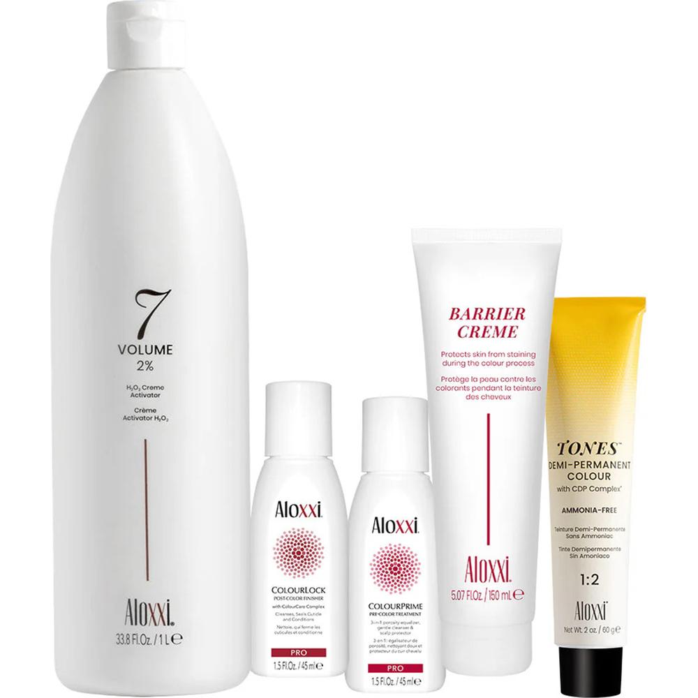 Aloxxi Tones Demi-Permanent Colour Small Salon Opener. Elevate your salon services with a comprehensive demi-permanent color system designed for professionals who demand both performance and perfection. The Aloxxi Tones Demi-Permanent Colour Small Salon Opener is your gateway to creative freedom, impeccable color results, and client satisfactionwithout the commitment of permanent color. This kit delivers everything you need to introduce or expand your tone-on-tone services while maintaining exceptional hair health and radiant shine.