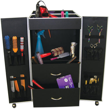 Aluminum Rollabout Cart. Fit everything you need into this strong sturdy Aluminum Rollabout Cart. Top lid has a zipper mesh pouch and opens up to a large work area that has 6 appliance and accessory holders. Inside features two large drawers (152"w x 7"D x 6-3/4" H) and a roomy shelf space. Each door has an assortment of pockets and elastic loops to store even more tools!