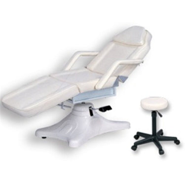 Alvida Hydraulic Chair with Stool. This unique bed with hydraulic pump for effortless lifting and lowering action, fiberglass base (Metal underneath) and face hole. This unique design turns 180° offering you excellent flexibility while working on clients. Features back and legs adjustment. Stool included.
