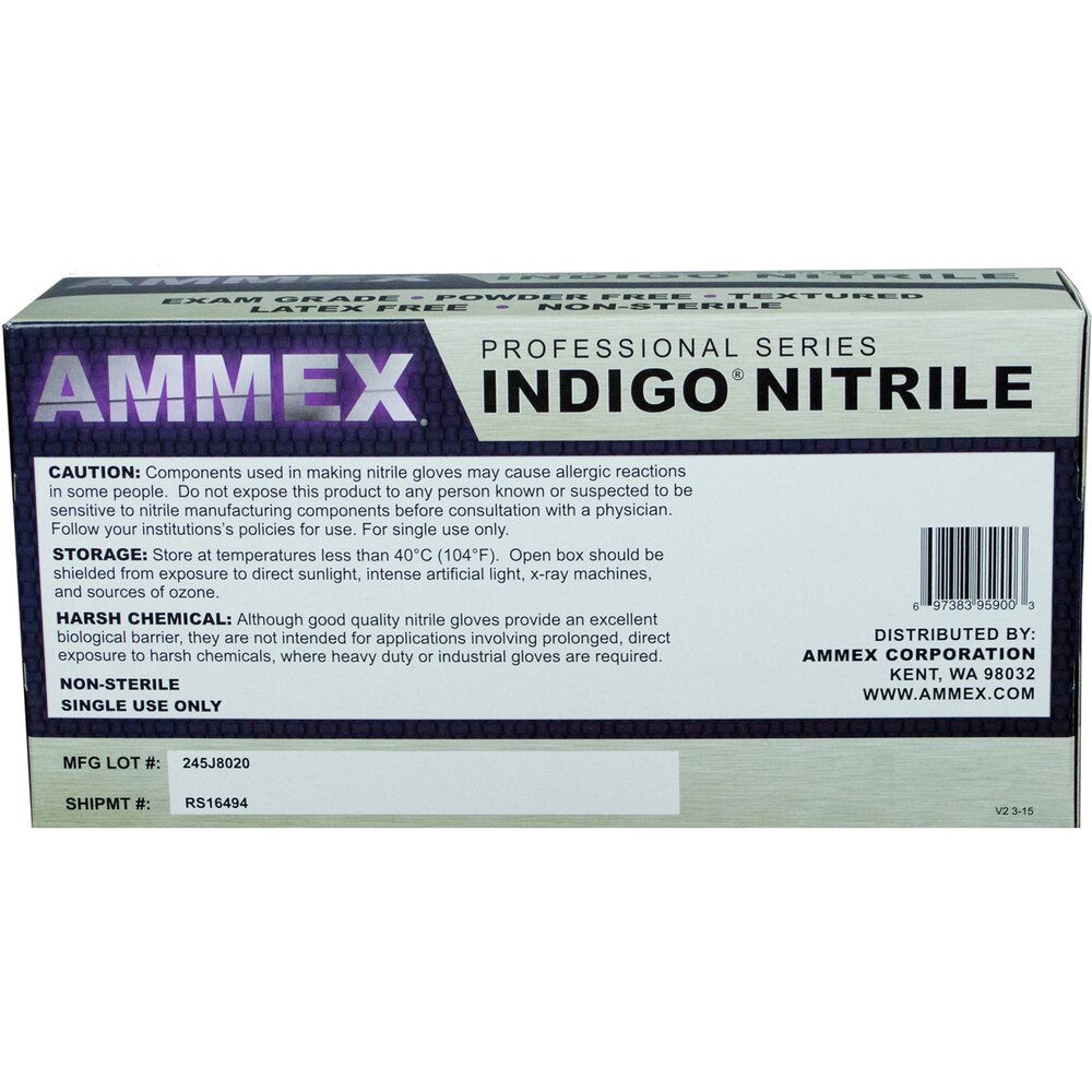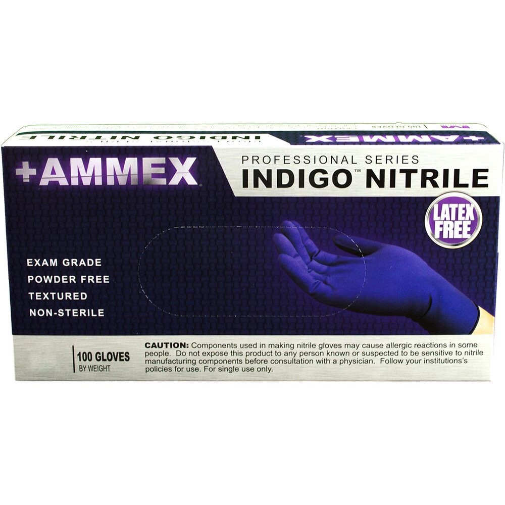 Ammex Indigo Nitrile Exam Latex-Free PF Disposable Gloves | 4 mil Thick | Sizes S-XL | 100 Gloves/Box; 10 Boxes/Case = Case of 1,000. As a healthcare professional, you wear gloves all day. The No. 1 consideration is safety, of course, but comfort is important, too. Ammex® Indigo Nitrile Powder Free Exam Gloves meet both needs. These durable, latex-free, 4-mil gloves are popular across the healthcare spectrum. S-XL, sold 100 per box, 10 boxes per case.