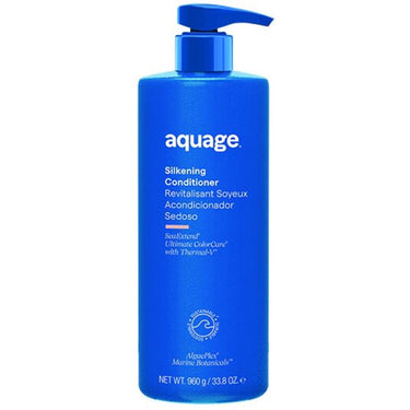 Aquage SeaExtend Silkening Conditioner / 33.8 oz. Aquage SeaExtend Silkening Conditioner is a luxurious conditioner designed for color-treated hair. Its organic bio-actives extracted from nutrient-rich algae restore flexibility, strength and resiliency in the hair. Algaeplex sea botanicals and Algasilk penetrate the hair to restore its health and shine. UVA/UVB sunscreens protect against fading and environmental damage, while Thermal-V technology creates a heat-activated shield during thermal styling. The conditioner is gentle on the scalp, cruelty-free, and free of gluten, parabens and sulfates. Aquage is also 100% plastic neutral, collecting 28% more plastic than they use and preventing 2.5 million plastic bottles from entering the ocean each year.