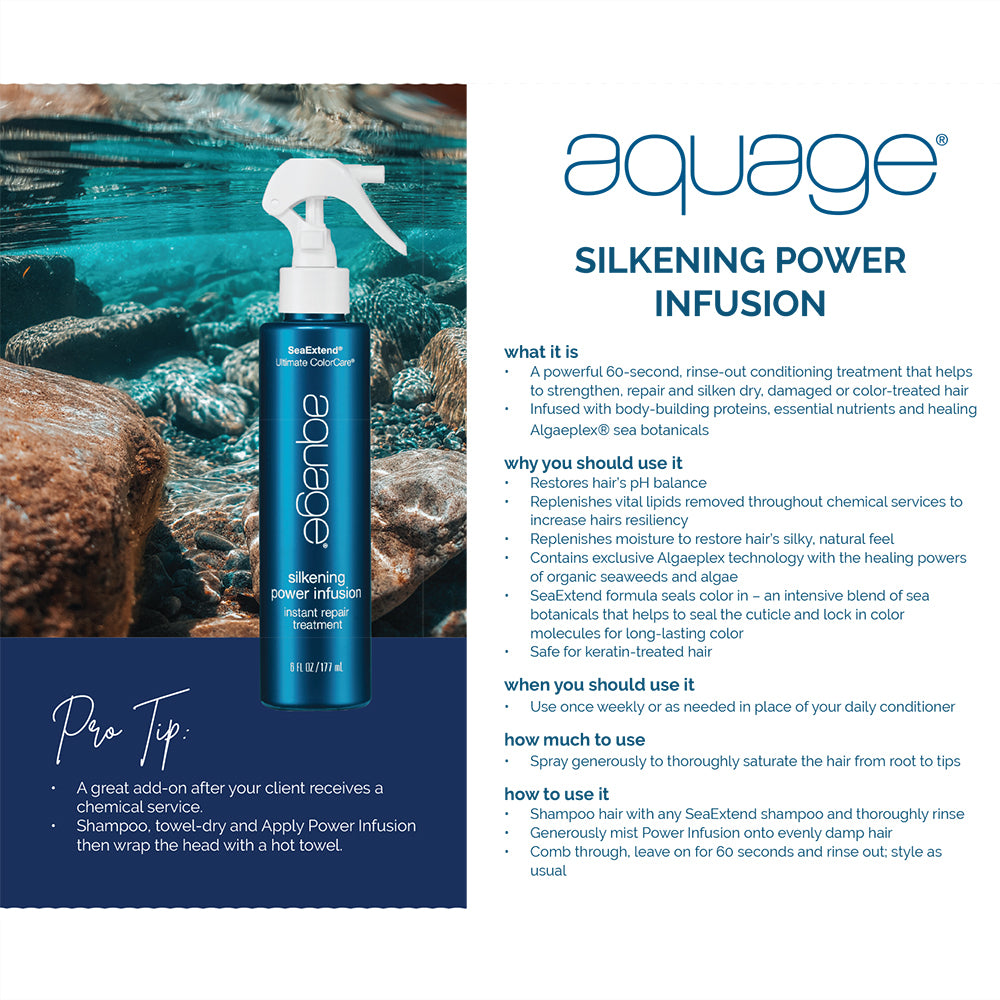 Aquage SeaExtend Silkening Power Infusion / 6 oz. Aquage SeaExtend Silkening Power Infusion is a powerful conditioning treatment designed for salons/spas to strengthen, repair and silken dry, damaged or color-treated hair. This 60-second, rinse-out treatment is infused with body-building proteins, essential nutrients, and Algaeplex technology containing the healing powers of organic seaweeds and algae to replenish moisture. The SeaExtend formula helps to seal the cuticle, lock in color molecules and restore the hair's pH balance and silky, natural feel. This product is cruelty-free and free of gluten, paraben, sodium chloride and sulfates, making it ideal for those with sensitive hair. Aquage also takes care of the environment by collecting 28% more plastic than they use, preventing 2.5 million plastic bottles from entering the ocean each year, making them 100% plastic neutral.