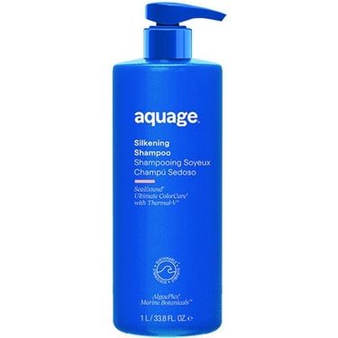 Aquage SeaExtend Silkening Shampoo / 33.8 oz. Aquage SeaExtend Silkening Shampoo is a rich, creamy shampoo ideal for coarse, curly, or frizzy hair. This shampoo is designed to dramatically improve manageability on coarse or curly hair types and helps to preserve hair color and protect the hair from thermal styling damage. The SeaExtend formula is an intensive blend of sea botanicals that helps to seal the cuticle and lock in color molecules to maintain longer hair color results. The SeaExtend Thermal-V Technology is a sea-derived, enzymatic complex that attaches deep within the hair shaft forming a heat-activated shield to prevent thermal styling damage. Organic bio-actives extracted from nutrient-rich algae restore flexibility, strength, and resiliency, while Algaeplex sea botanicals and Algasilk penetrate to restore color-treated hair to optimum health with extraordinary shine and feel. UVA/UVB sunscreens prevent fading and environmental damage to help maintain hair color vibrancy longer. This shampoo is cruelty-free, free of gluten, parabens, sodium chloride, and sulfates, and 100% plastic neutral.