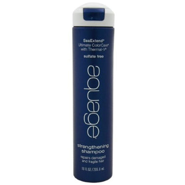 Aquage SeaExtend Strengthening Shampoo / 10 oz. Aquage SeaExtend Strengthening Shampoo is a luxurious and highly-concentrated shampoo that helps to preserve hair color and protect the hair from heat styling damage. The Algaeplex sea botanicals and Algasilk penetrate the hair to restore color-treated hair to optimum health, while UVA/UVB sunscreens prevent fading and environmental damage to keep the color vibrant. With its SeaExtend formula and Thermal-V Technology, this shampoo provides an intensive blend of sea botanicals that help to seal the cuticle and lock in color molecules, forming a heat-activated shield to prevent heat styling damage. Ideal for salons/spas, this cruelty-free and sulfate-free shampoo is a great way to strengthen and repair damaged hair. Aquage is also 100% plastic neutral, collecting 28% more plastic than they use and preventing 2.5 million plastic bottles from entering the ocean each year.