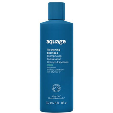 Aquage SeaExtend Thickening Shampoo / 8 oz. Aquage SeaExtend Thickening Shampoo, 8 oz is a luxurious shampoo designed for salons and spas to cater to clients with fine, thin or lifeless hair. The shampoo revitalizes hair by adding body and fullness while providing ultimate color care that seals heat out and prevents thermal styling damage. Its AlgaePlex marine botanicals penetrate deep into the hair shaft to restore color-treated hair to optimum health, leaving it with extraordinary shine and feel. The shampoo is cruelty-free and free of gluten, parabens, sodium chloride, and sulfates. Moreover, Aquage is 100% plastic neutral, meaning they collect 28% more plastic than they use and prevent 2.5 million plastic bottles from entering the ocean each year.