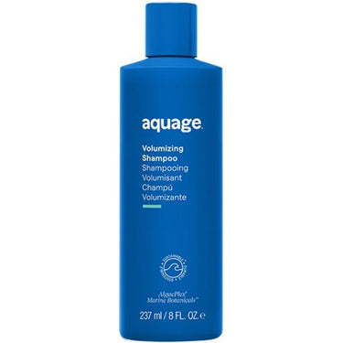 Aquage Volumizing Shampoo / 8 oz. Aquage Volumizing Shampoo is designed to revitalize hair by adding body and fullness. It features SeaExtend Thermal-V Technology, a sea-derived enzymatic complex that forms a heat-activated shield to prevent thermal styling damage. The shampoo is enriched with organic bio-actives extracted from nutrient-rich algae, which restore flexibility, strength, and resiliency. The Algaeplex sea botanicals and Algasilk penetrate to restore color-treated hair to optimum health with extraordinary shine and feel. UVA/UVB sunscreens prevent fading and environmental damage to help maintain hair color vibrancy longer. The shampoo is cruelty-free, gluten-free, paraben-free, and sulfate-free, and is great for Salon Retail. Aquage is 100% plastic neutral, collecting 28% more plastic than they use and preventing 2.5 million plastic bottles from entering the ocean each year.