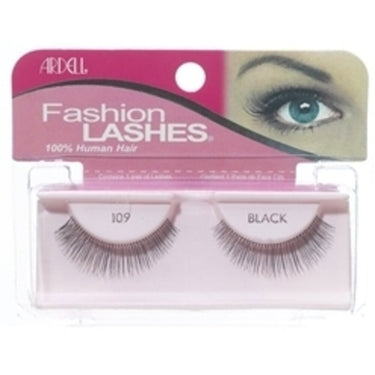 Ardell Black 109 Fashion Lashes / 1 Pair. Ardell Black 109 Fashion Lashes look so natural. Made of 100% sterilized human hair, each lash strip is knotted and feathered by hand to achieve the highest quality. Each pair can be re-used up to three weeks. 1 pair.
