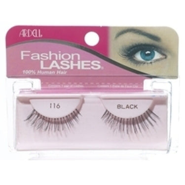 Ardell Black 116 Fashion Lashes / 1 Pair. Ardell Black 116 Fashion Lashes look so natural. Made of 100% sterilized human hair, each lash strip is knotted and feathered by hand to achieve the highest quality. Each pair can be re-used up to three weeks. 1 pair.