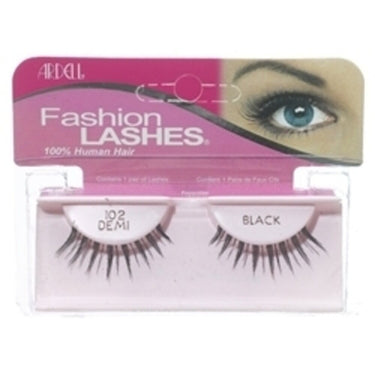 Ardell Black Demi 102 Fashion Lashes / 1 Pair. Ardell Black Demi 102 Fashion Lashes look so natural. Made of 100% sterilized human hair, each lash strip is knotted and feathered by hand to achieve the highest quality. Each pair can be re-used up to three weeks. 1 pair.