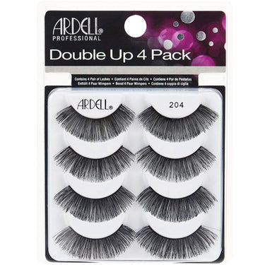 Ardell Double Up Strip Lashes #204 / 4 Pair. Double Up Lashes have twice the amount lashes for a more dramatic look. Double layer style gives you a fuller, thicker look. Reusable. Each lash strip is knotted and feathered by hand to achieve the highest quality. Achieve the ultimate glamour look with these 6 new styles!