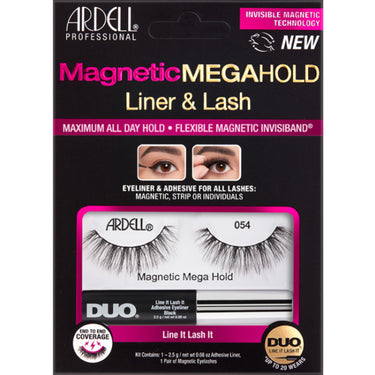 Ardell Mega Hold Magnetic Liner & Lash #054. Bulky magnets are gone! Patented techology creates an unde- tectable magnet band end-to-end for ultra hold. Soft magnet can be trimmed for optimal fit for all shapes with no sharp magnetic pieces poking your lash line. Kit includes newand improved 2.5 gram DUO Line It Lash It; a new formulation that works with alltypes of lashes whether magnetic or not.